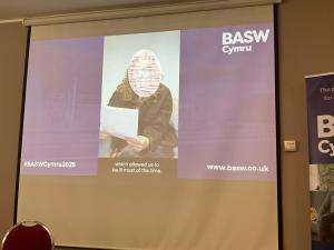 Kathryn Lawrence (BASW Cymru National Standing Committee member) addressing conference to introduce a powerful film with Leah (Expert by Experience)